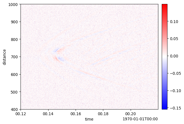 Changes to default scale behavior: Until DASCore version 0.1.13, the default behavior when scale=None was to scale along the entire range of the data. However, very often in real data a few anomalously large or small values would obscure most of the patch details. In version 0.1.13 the default behavior is to now use a statistical fence to avoid the problem. To get the old behavior, simply set scale=1.0.