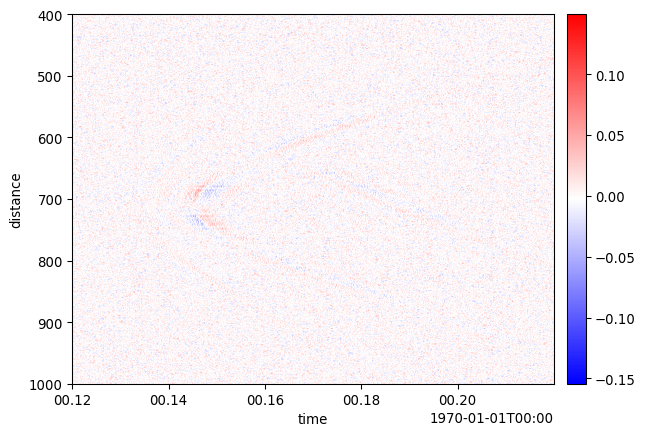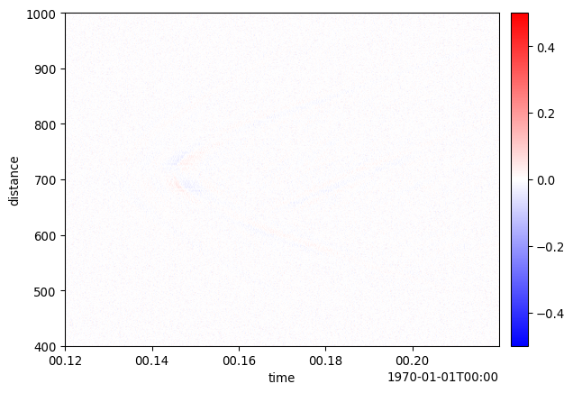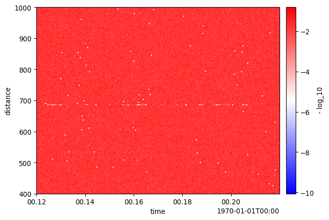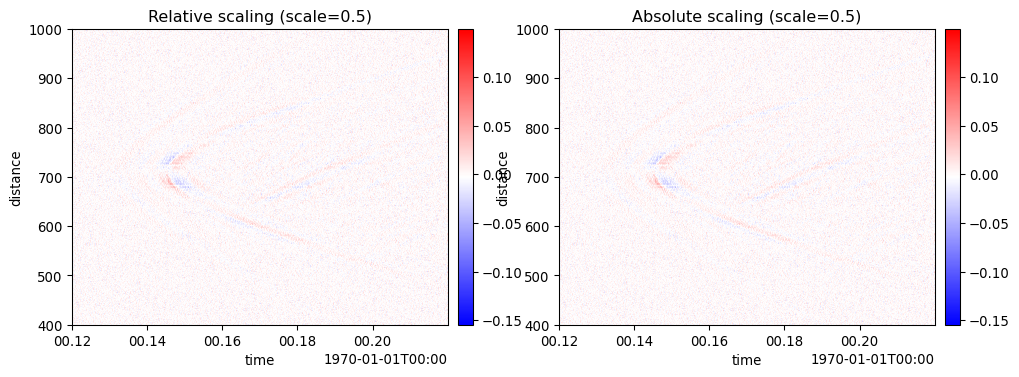 # Plot with default scaling (uses 1.5*IQR fence to exclude outliers)import dascore as dcfrom dascore.units import percentpatch = dc.get_example_patch("example_event_1").normalize("time")_ = patch.viz.waterfall()# Use relative scaling with a tuple to show a specific fraction# of data range. Scale values of (0.1, 0.9) map to 10% and 90%# of the data's [min, max] range_ = patch.viz.waterfall(scale=0.1, scale_type="relative")# Likewise, percent units can be used for additional clarity_ = patch.viz.waterfall(scale=10*percent, scale_type="absolute")# Use relative scaling with a tuple to show the middle 80% of data range# Scale values of (0.1, 0.9) map to 10% and 90% of [data_min, data_max]_ = patch.viz.waterfall(scale=(0.1, 0.9), scale_type="relative")# Use absolute scaling to set specific colorbar limits# This directly sets the colorbar limits to [-0.5, 0.5]_ = patch.viz.waterfall(scale=(-0.5, 0.5), scale_type="absolute")# Visualize data on a logarithmic scale# Useful for data spanning multiple orders of magnitude_ = patch.viz.waterfall(log=True)# Compare scale types: relative vs absoluteimport matplotlib.pyplot as pltfig, (ax1, ax2) = plt.subplots(1, 2, figsize=(12, 4))# Relative: 0.5 means ±50% of dynamic range around mean_ = patch.viz.waterfall(scale=0.5, scale_type="relative", ax=ax1)_ = ax1.set_title("Relative scaling (scale=0.5)")# Absolute: 0.5 means colorbar limits are [-0.5, 0.5]_ = patch.viz.waterfall(scale=0.5, scale_type="absolute", ax=ax2)_ = ax2.set_title("Absolute scaling (scale=0.5)")# Undo Y axis inversion which occurs when time is on the Yax = patch.viz.waterfall()ax.invert_yaxis()