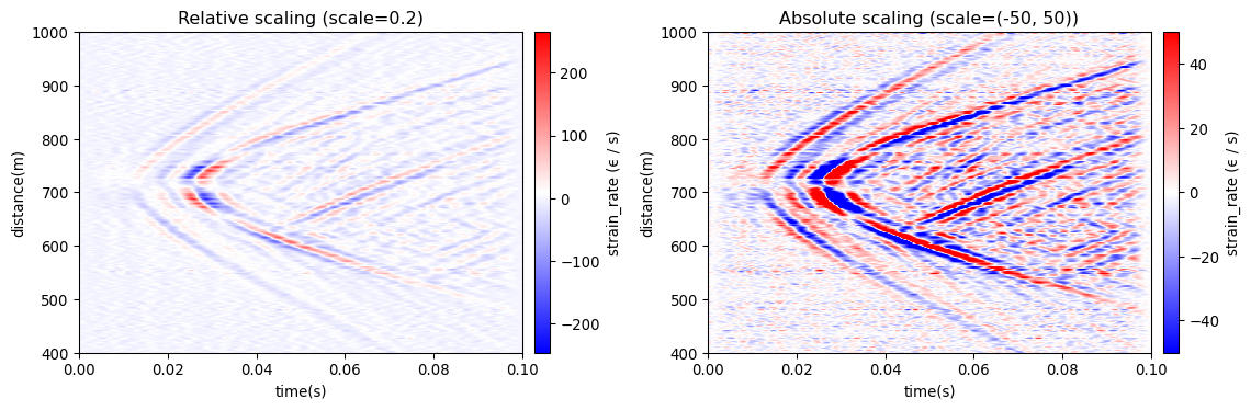 <Axes: xlabel='time(s)', ylabel='distance(m)'>The scale parameter controls the colorbar saturation. By default, waterfall uses a statistical fence (1.5×IQR) to exclude outliers and show the majority of the data clearly.