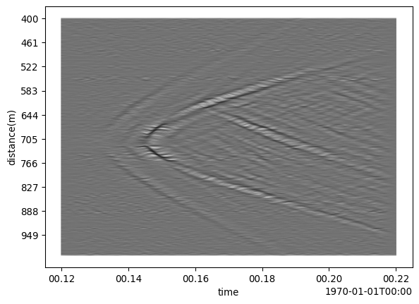 patch.viz.wiggle(scale = .5)<Axes: xlabel='time', ylabel='distance(m)'>